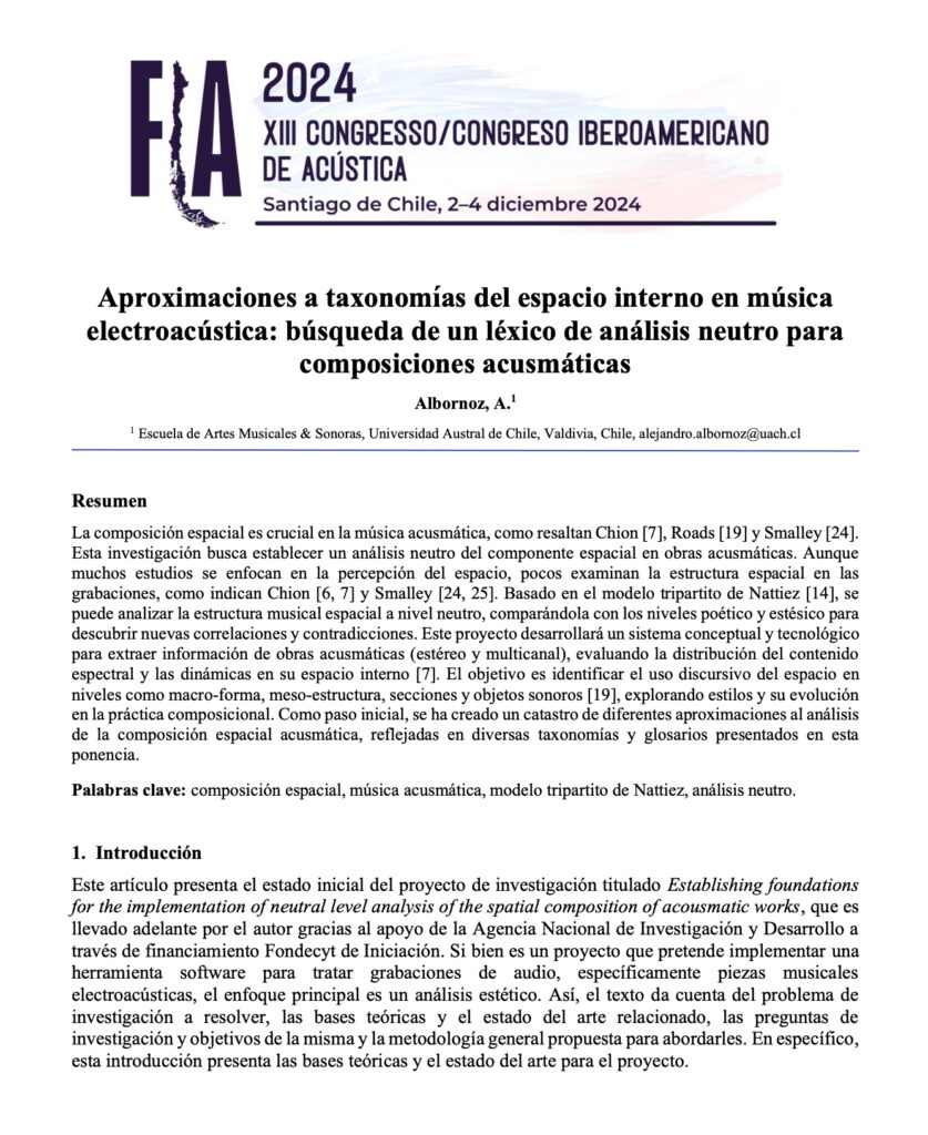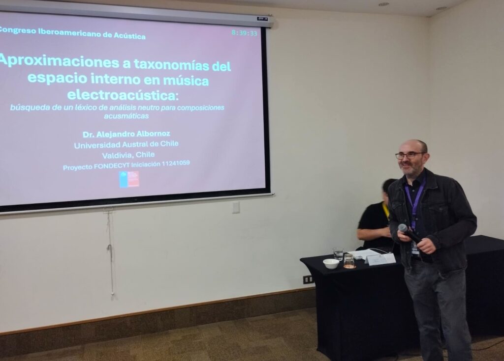 El Dr. Alejandro Albornoz presentó la ponencia Aproximaciones a taxonomías del espacio interno en música electroacústica: búsqueda de un léxico de análisis neutro para composiciones acusmáticas en el XIII Congreso Iberoamericano de Acústica FIA 2024 en Santiago de Chile, celebrado entre el 2 y el 4 de diciembre de 2024.